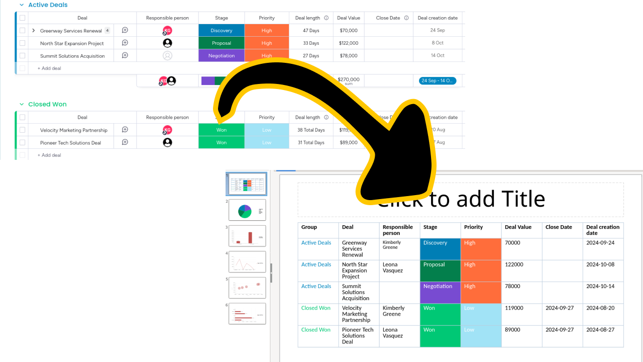 Export your monday.com board data into clean, professional-looking slides with tables and charts. Perfect for client updates, reports, and internal reviews.