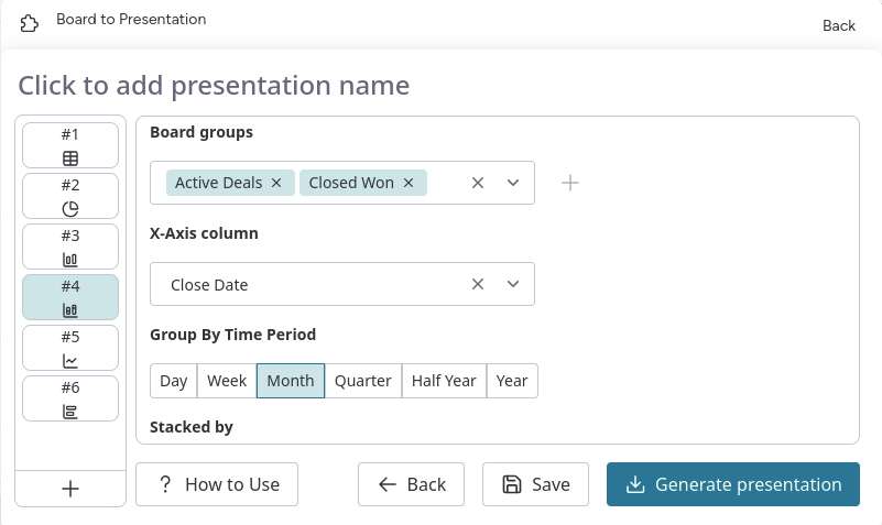 Customize your slides by selecting board groups and columns and adding details for clarity.