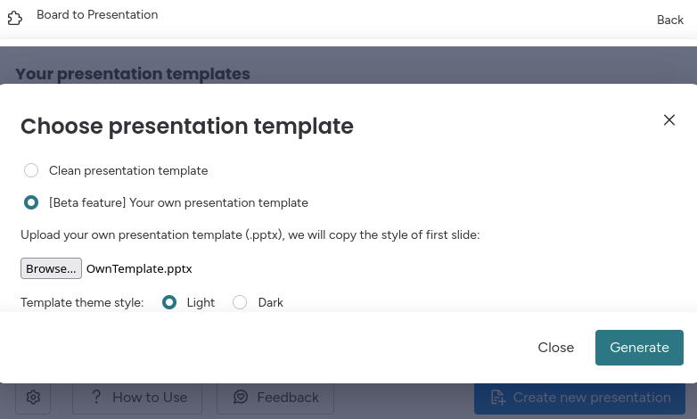 If you want generate presentation with your own template style, upload it! You can also use the default clean template.